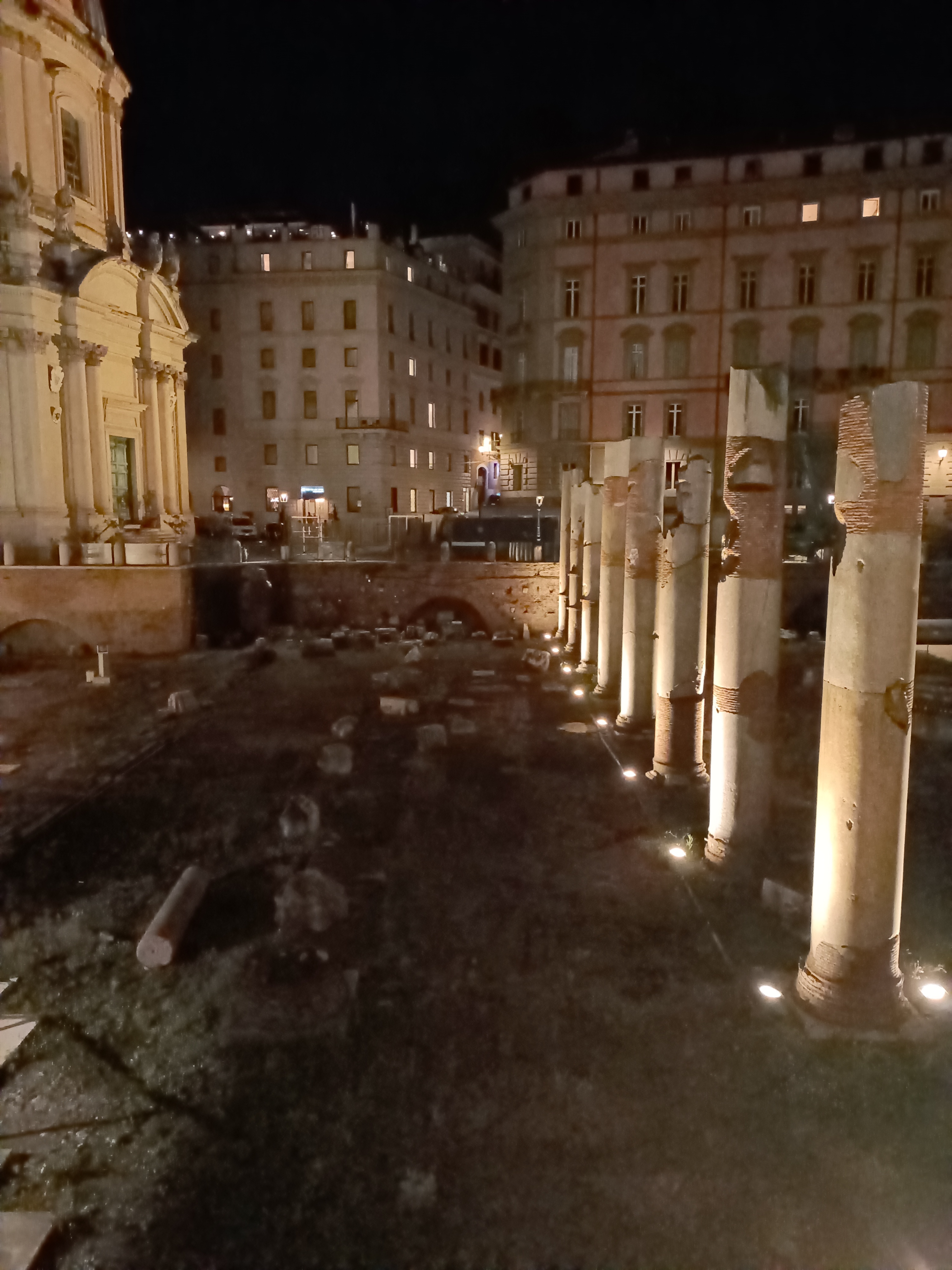 Di notte per le strade di Roma, il buio del cielo che fa da contrasto e le luci sui fori romani che fanno risaltare le meraviglie che invadono strade e piazze, luoghi mai visitati, in una città finalmente svuotata dal caos, dal rumore, dalla luce. L’una di notte e oltre. Quella sensazione di libertà mista alla paura di vagare in una mega metropoli. Quella semi ubriacatezza che diventa totale assaporando tutta quella magnificenza. C’è un tempo nel viaggio per stare da soli, per guardare con occhi antichi spazi, strade e sguardi fugaci. La città eterna che di notte si spoglia pian piano per avvolgerti con dolcezza nelle sue braccia e posarti sul suo ventre.