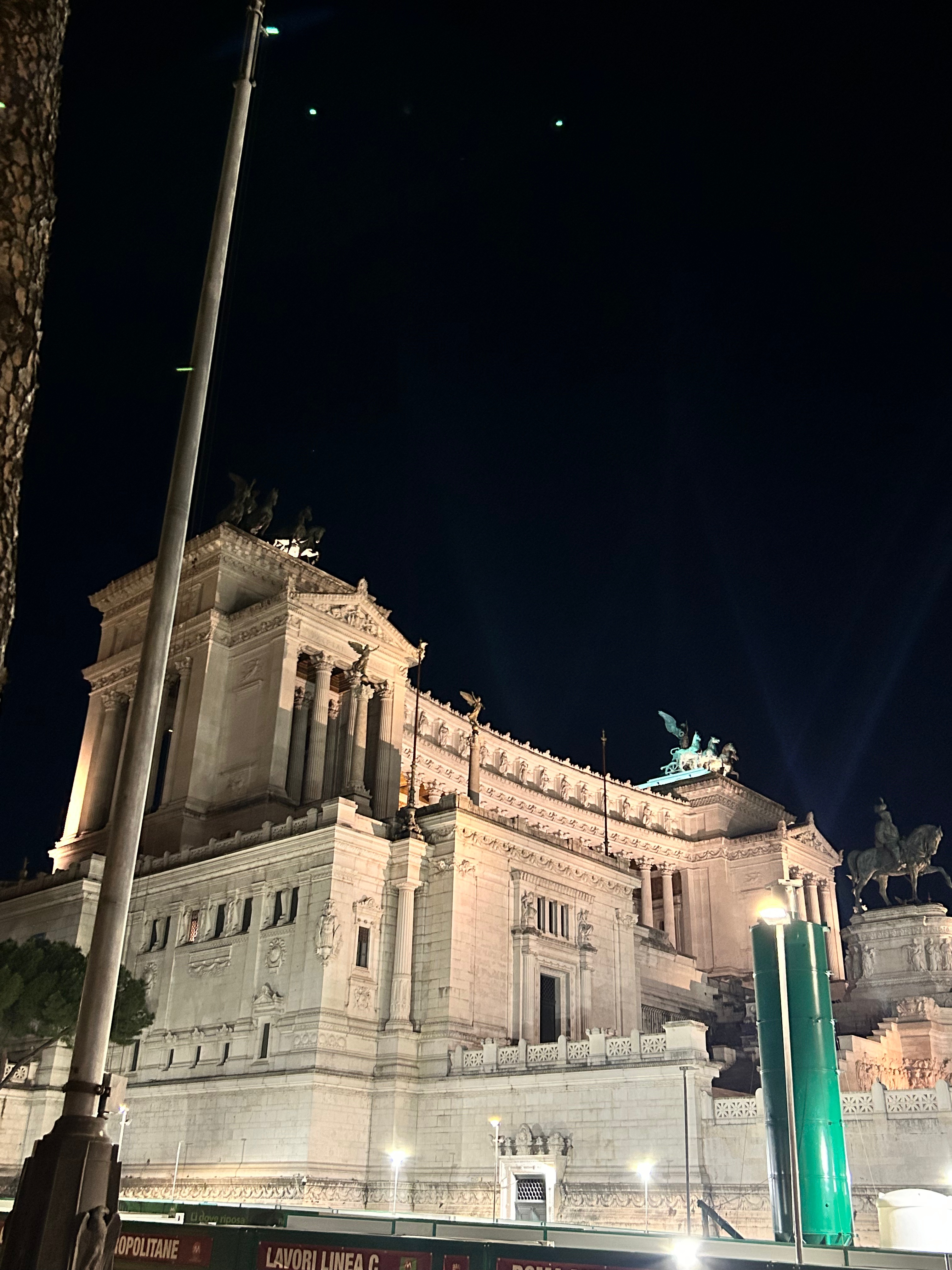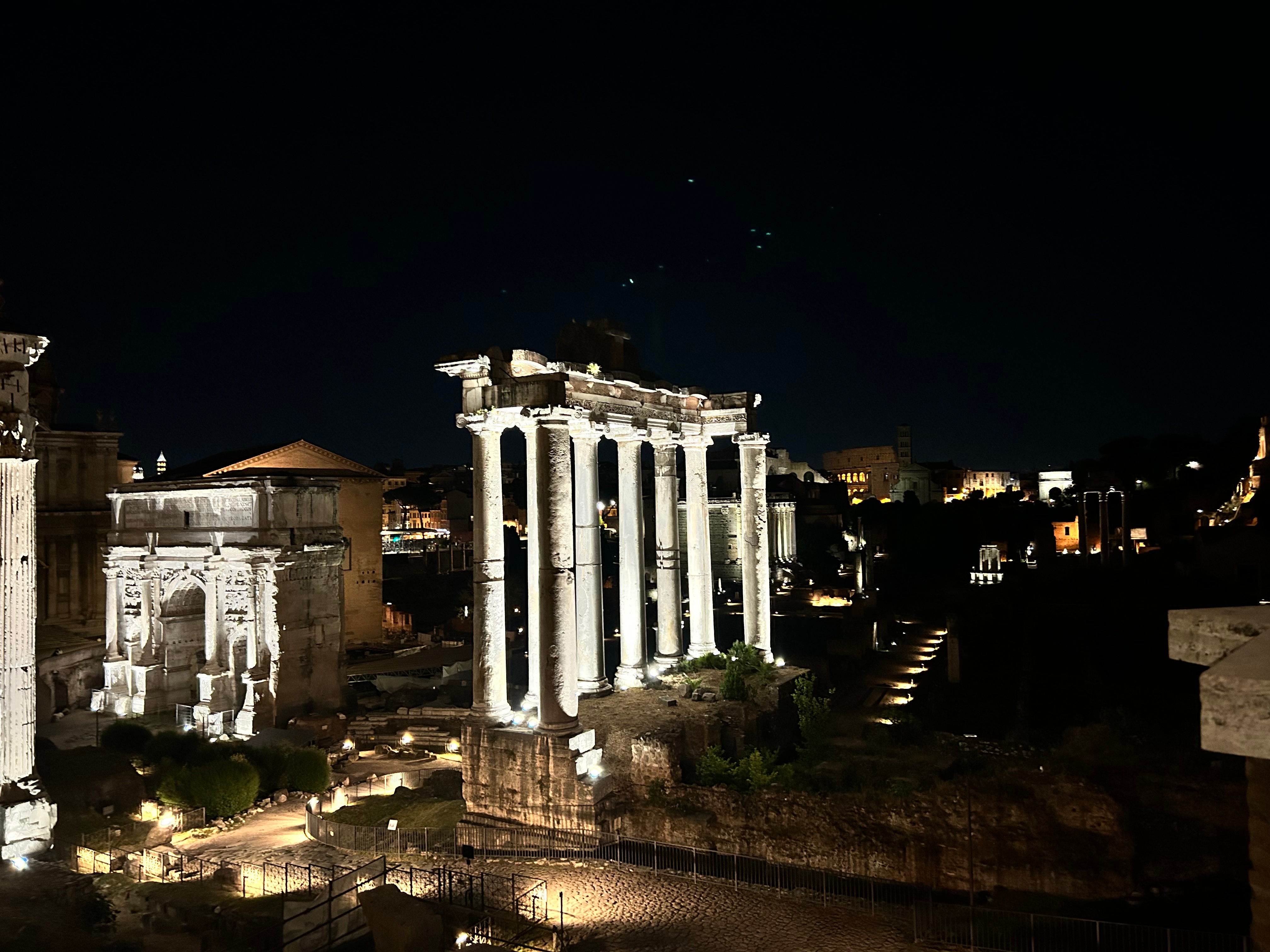 Usciamo sorridenti e l’accento romano si impossessa di me mentre attraversiamo il Ponte Fabricio. Ri-attraversiamo di notte il Portico di Ottavia e non posso non portarti in uno dei luoghi più magici per me della Roma notturna. Il punto di vista privilegiato per eccezione sulla Roma antica.